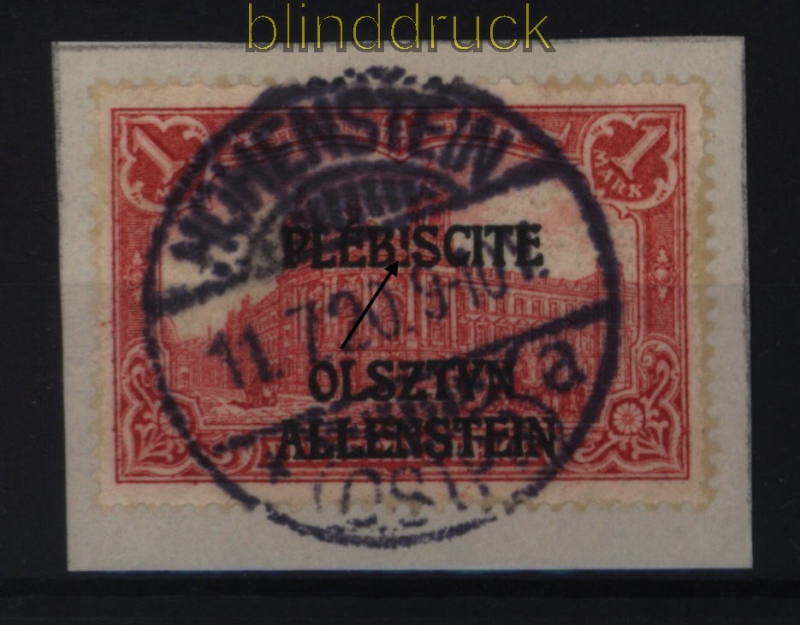 Abstimmungsgebiete Allenstein Mi # 10 gestempelt Audfruckfehler Aufdruckmarke 1 Mark gestempelt mit Aufdruckfehler im i von Plebescite Erhaltung siehe Scan