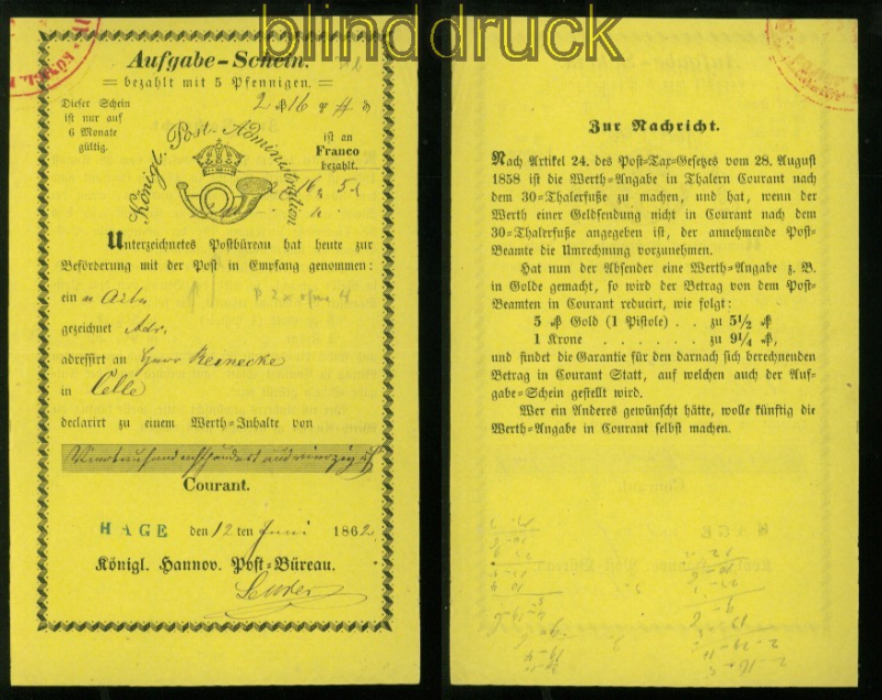 Altdeutschland Hannover Hage Aufgabe-Schein 1862 gelb gelbes formular blauer L1 Hage für einen Wertbrief 12.6.1862 nach Celle Erhaltung siehe Scan