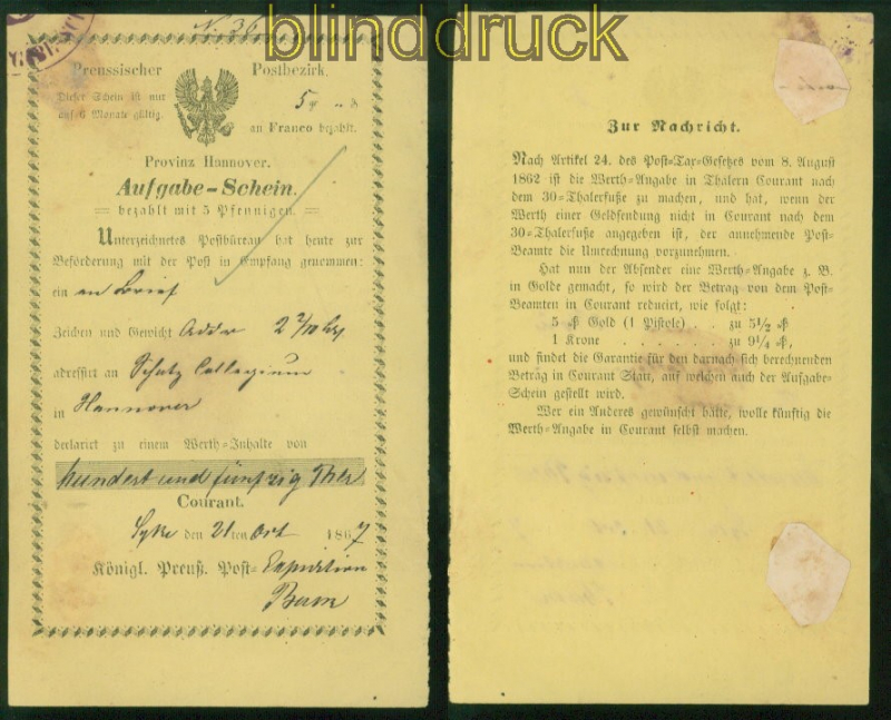 Altdeutschland Hannover Syke Aufgabe-Schein 1867 gelb gelbes Formular Preussischer Postbezirk Provinz Hannover für einen Wertbrief 21.10.1867 nach Hannover Erhaltung siehe Scan