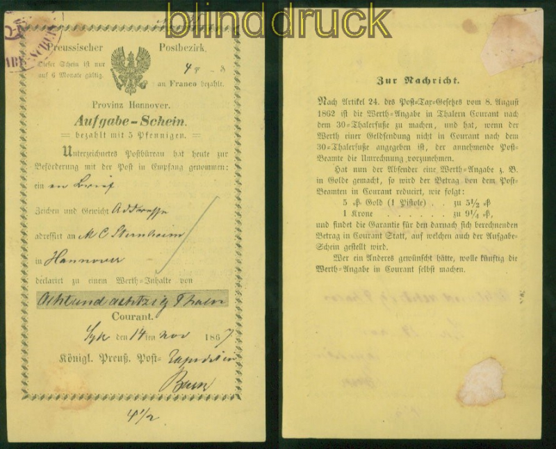 Altdeutschland Hannover Syke Aufgabe-Schein 1867 gelb gelbes Formular Preussischer Postbezirk Provinz Hannover für einen Wertbrief 14.11.1867 nach Hannover Erhaltung siehe Scan