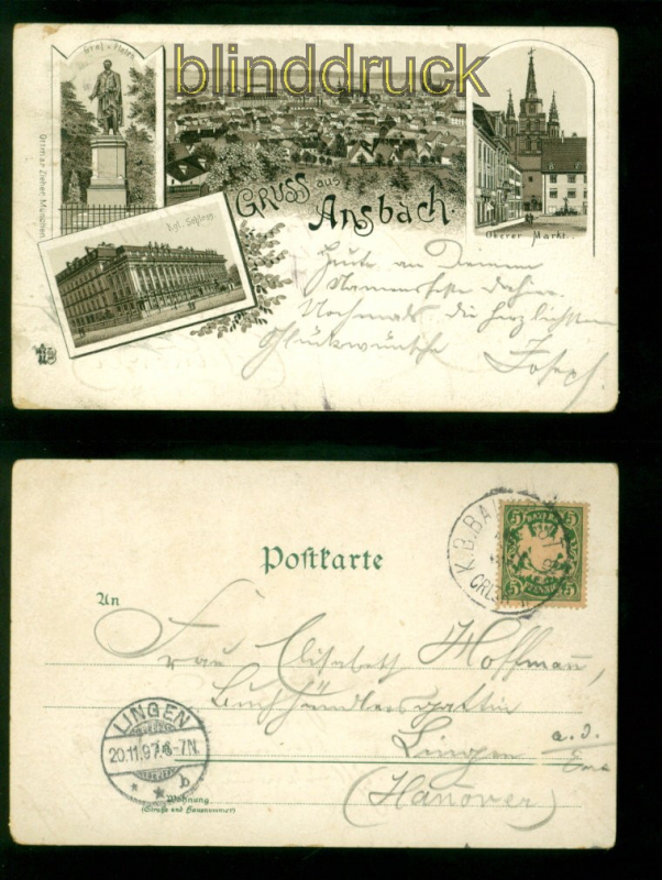 Bayern Gruss aus Ansbach Litho-AK vier Ansichten 1897 nach Lingen vier Ansichten: Denkmal Graf von Platen, Gesamtansicht, Oberer Markt und Kgl. Schloss Karte gelaufen mit Bahnpost 1897 nach Lingen Ankunftsstempel Erhaltung siehe Scan