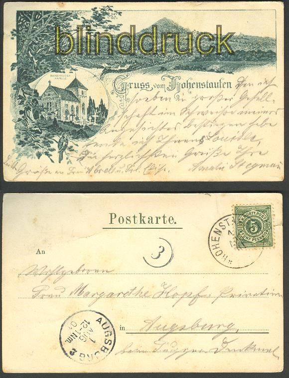 Baden-Württemberg Gruss vom Hohenstaufen sw-AK mit Barbarossa-Kapelle 1901 Karte gelaufen aus Hohenstaufen 1.8.1901 nach Augsburg Erhaltung siehe Scan