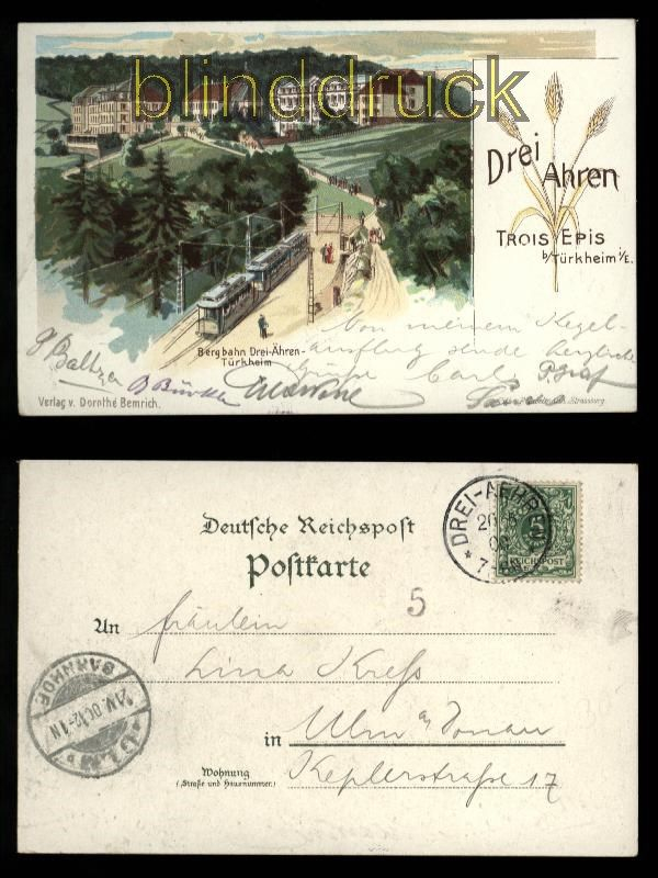 Elsaß Drei Ähren farb-AK Trois Epis beiTtürkheim im Elsaß 1900 Bergbahn drei-Ähren - Türkheim Karte gelaufen Drei-Ähren 20.5.1900 nach Ulm an der Donau Erhaltung siehe Scan
