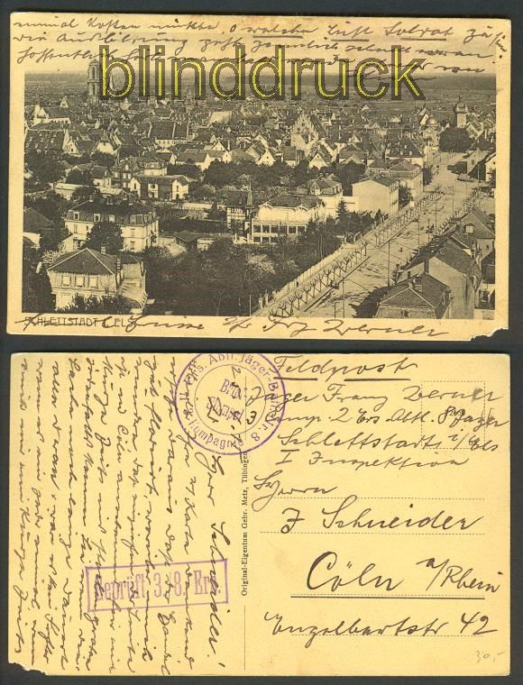 Elsass Schlettstadt im Elsass sw-AK Totalansicht Feldpost 1. WK Karte gelaufen als Feldpostkarte 1. Weltkrieg nach Cöln am Rhein untere rechte Ecke etwas beschädigt Erhaltung siehe Scan