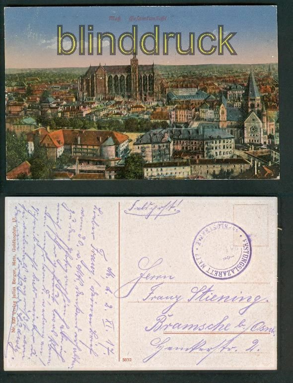 Lothringen Metz farb-AK Gesamtansicht Feldpost 1917 Karte gelaufen als Feldpostkarte 2.11.1917 nach Bramsche mit Briefstempel: Festungslazarett Metz ???eldstrasse Erhaltung siehe Scan