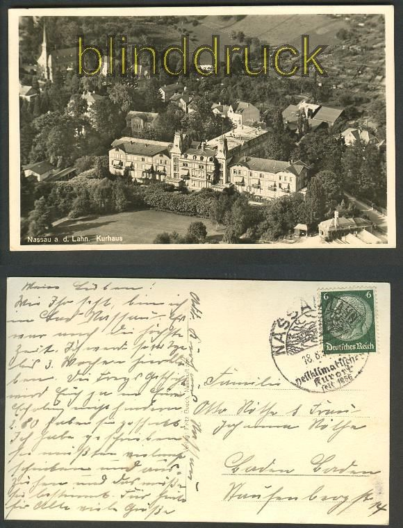 Hessen Nassau an der Lahn sw-Foto-AK Kurhaus Fliegeraufnahme Karte gelaufen mit Sonderstempel SSt. Naussau 18.8.1935 nach Baden-Baden Erhaltung siehe Scan  SEMI