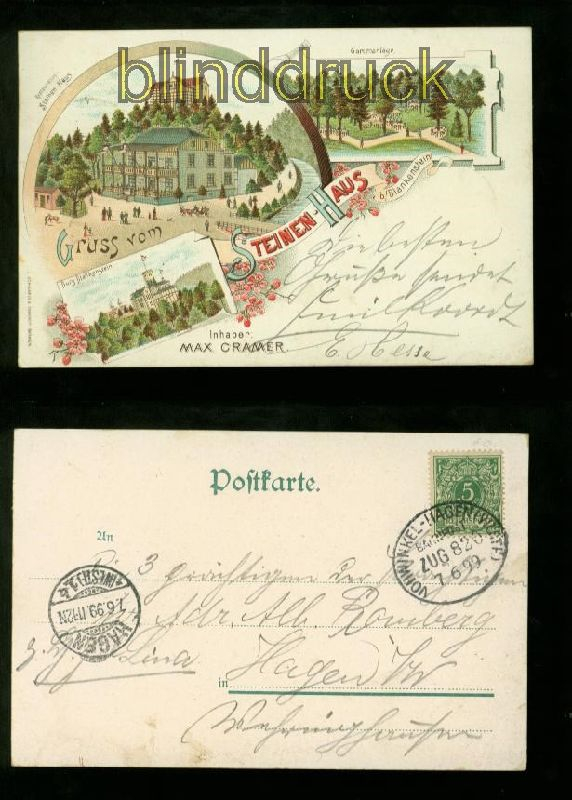 Nordrhein-Westfalen BLANKENSTEIN farb-Lirho-AK Gruss vom Steinen-Haus Bahnpost 1899 Karte gelaufen mit Bahnpost VOHWINKEL - HAGEN (WESTF.) Zug 820 7.3.1899 nach Hagen Erhaltung siehe Scan