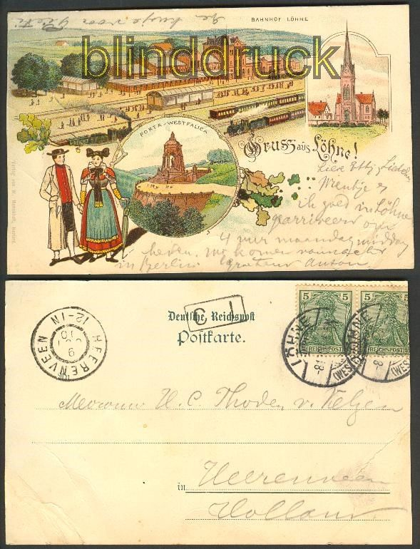 NRW Löhne farb-Litho-AK Bahnhof Löhne Kirche und Porta Westfalica Karte gelaufen aus Löhne 8.10.1900 nach Heerenveen/Holland Verlag von W. Menckhoff Herford Karte links und rechts unten etwas knittrig und links wohl etwas beschnitten Erhaltung siehe Scan  SEMI