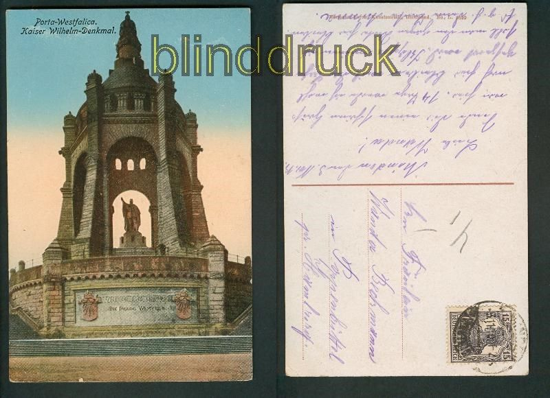 Nordrhein-Westfalen Porta-Westfalica farb-AK Kaiser-Wilhelm-Denkmal 1919 Karte gelaufen aus Minden 3.3.1919 nach Poppenbüttel Erhaltung siehe Scan
