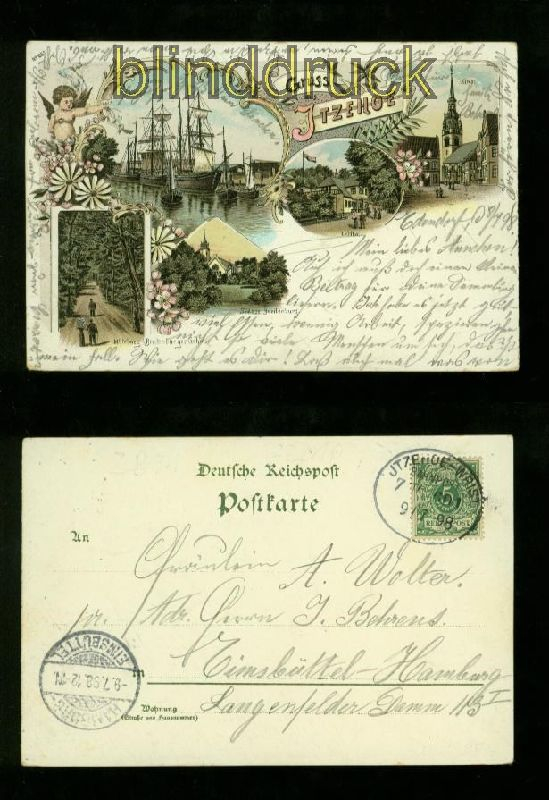 Schleswig-Holstein Gruss aus ITZEHOE farb-Litho-AK fünf Ansichten 1898 fünf Ansichten: Hafen, Eichthal, Kirche, Schloss Breitenburg und Mittelweg im Breitenburger gehölz Karte gelaufen mit Bahnpost ITZEHOE - WRIST Zug 601 9.7.1898 nach Eimsbüttel Erhaltung siehe Scan