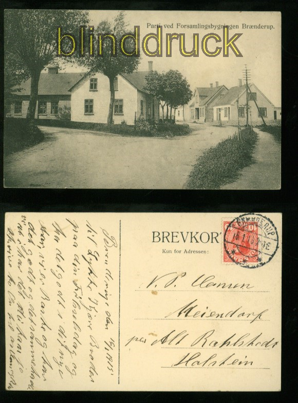 Dänemark Bränderup sw-AK Parti ved Forsamlingsbygningen Braenderup 1915 Karte gelaufen aus Braenderup 16.1.1915 nach Meiendorf per Alt Rahlstedt Erhaltung siehe Scan