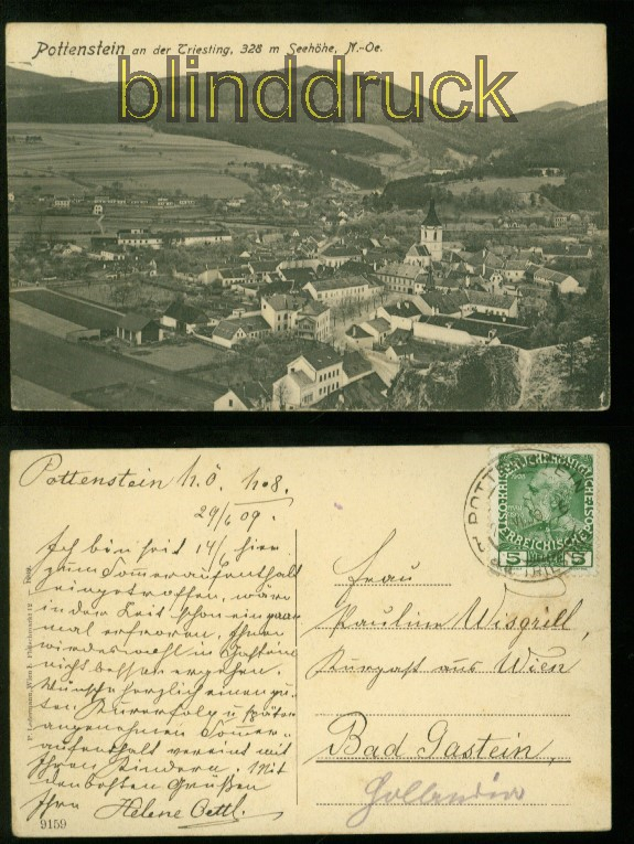 Österreich Pottenstein a. d. Triesting sw-AK 328 m Seehöhe Totalansicht Karte gelaufen aus Pottenstein 26.6.1909 nach Bad Gastein Erhaltung siehe Scan