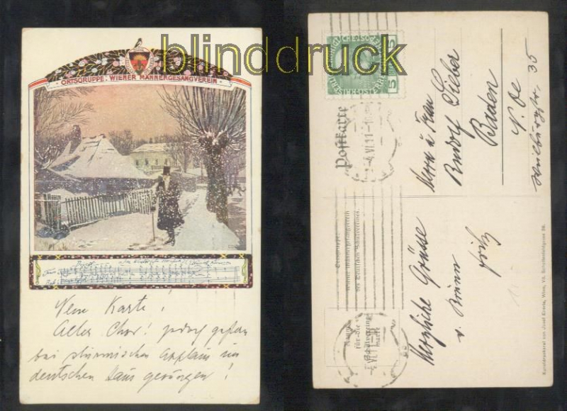 Österreich WIEN farb-AK Ortsgruppe Wiener Männergesangsverein 1911 Deutsacher Schulverein 1860 Karte gelaufen aus Wien 4.6.1911 nach Baden Erhaltung siehe Scan