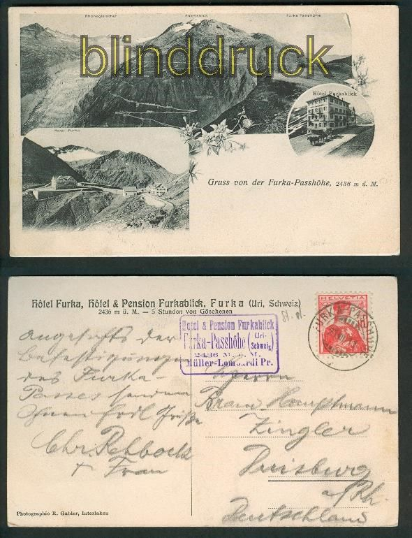 Schweiz Gruss von der Furka-Passhöhe sw-AK drei Ansichten 1911 Panoramaansicht mit Rhonegletscher, Galenstock und Furka Passhöhe, Hotel Furka und Hotel Furkablick Karte gelaufen aus Furka-Passhöhe 21.7.1911 nach Duisburg Erhaltung siehe Scan