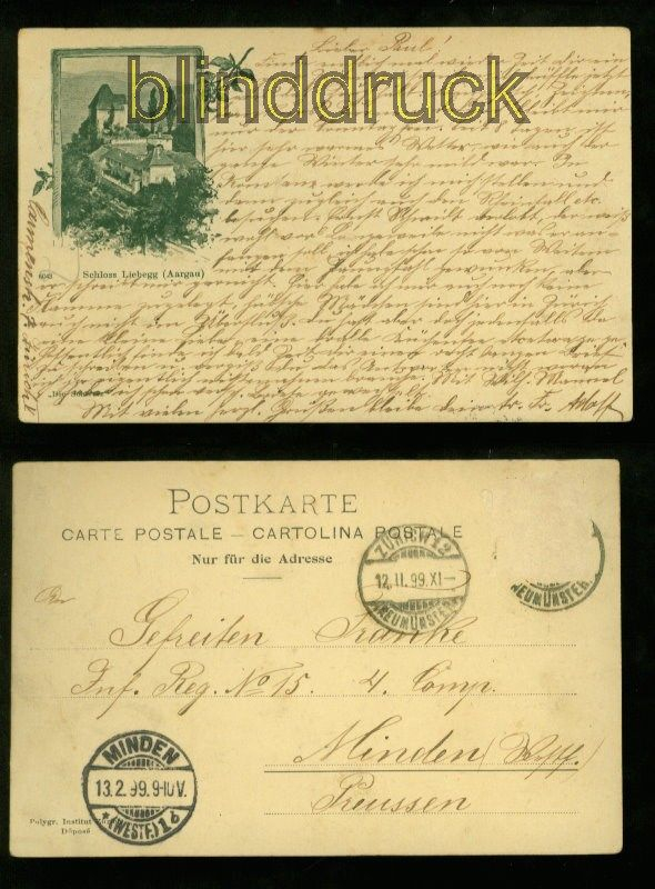 Schweiz LIEBEGG sw-AK Schloß 1899 Karte gelaufen aus Zürich 12.2.1899 nach Minden Marke entfernt Erhaltung siehe Scan