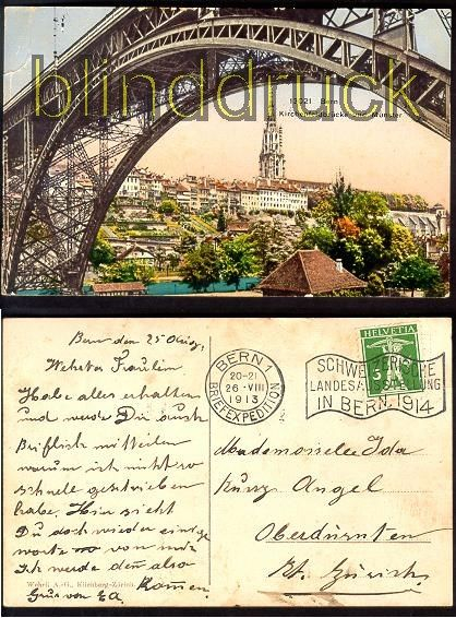 Schweiz farb-AK Bern Kirchenfeldbrücke und Münster Karte gelaufen aus Bern 26.8.1913 nach Ober-Dürnten gute Erhaltung siehe Scan