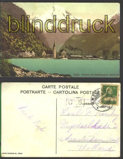 Schweiz farb-AK Flüelen mit Bristenstock (3074 m) Karte gelaufen mit Bahnpost Ambulant 14.7.1927 - 67 nach Amsterdam Erhaltung siehe Scan