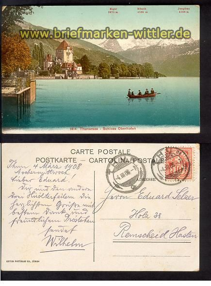 Thunersee - Schloss Oberhofen farb-AK Karte gelaufen Thun 6.3.1908 nach Remscheid-Hasten