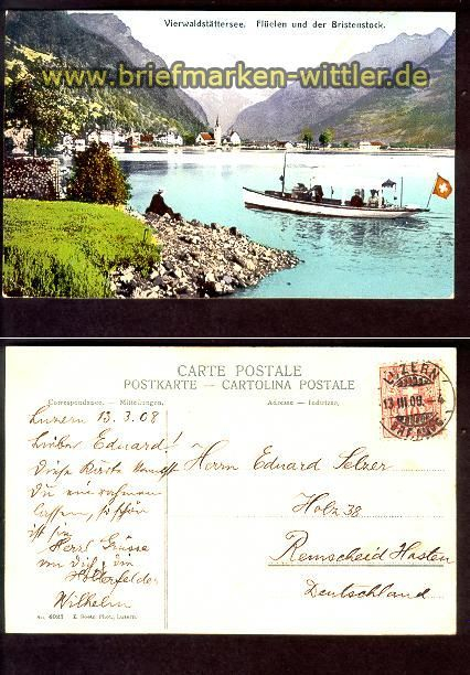 Vierwaldstättersee farb-AK Flüelen und der Bristenstock Karte gelaufen Luzern 13.3.1908 nach Remscheid-Hasten