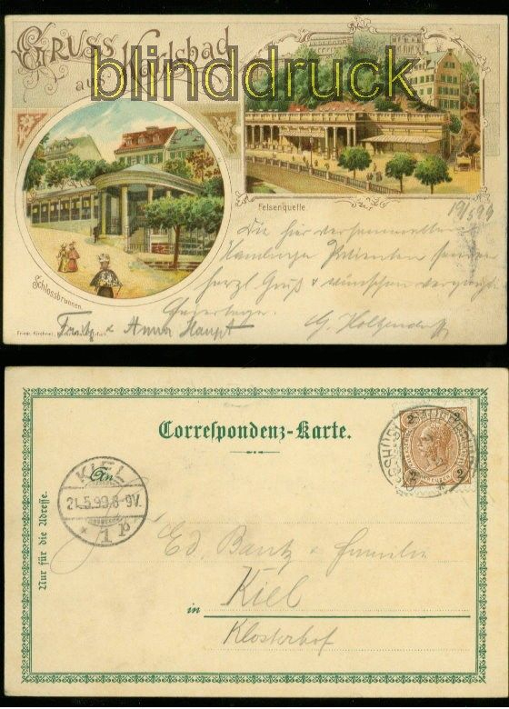 Tschechien Karlsbad farb-Litho-AK 2 Ansichten 1899 2 Ansichten: Schlossbrunnen und Felsenquelle Karte gelaufen aus Gießhübl-Sauerbrunn 19.5.1899 nach Kiel Erhaltung siehe Scan