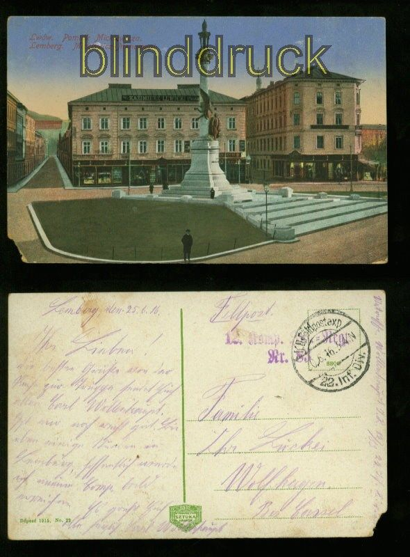 Ukraine LEMBERG LWÓW farb-AK Mickiewicz-Monument Feldpost 1916 Pomnick Mickiewicza Karte gelaufen mit Feldpost 30.6.1916 nach Wolfhagen Eckfehler unten links Erhaltung siehe Scan