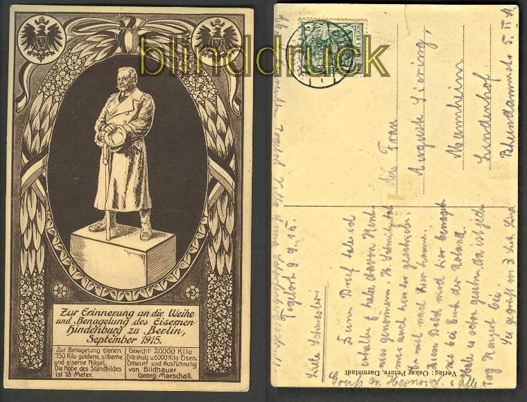 Zur Erinnerung an die Weihe und Benagelung des Eisernen Hindenburg zu Berlin sw-AK 1915Karte gelaufen aus Berlin 9.9.1915 nach MannheimErhaltung siehe Scan