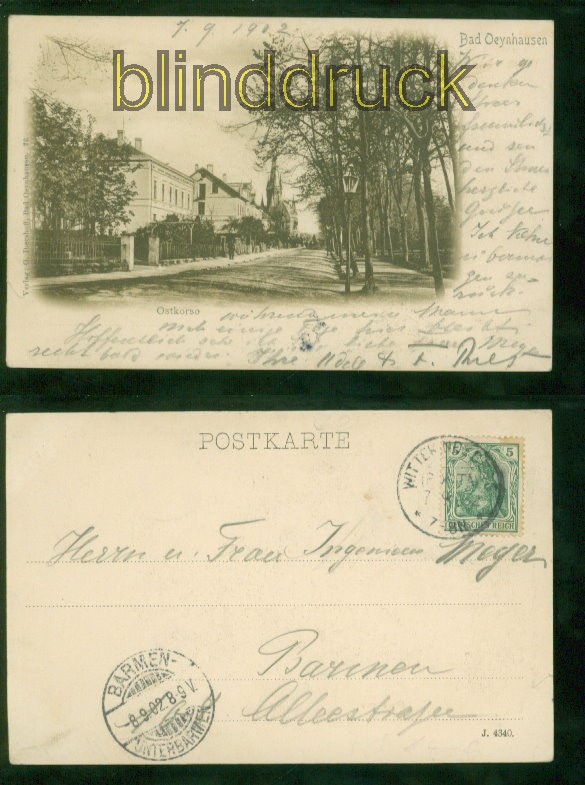 Nordrhein-Westfalen Bad Oeynhausen sw-AK Ostkorso Wittekindsberg 1902 nach Barmen Karte gelaufen aus Wittekindsberg 7.9.1902 nach Barmen Ankunftsstempel Erhaltung siehe Scan