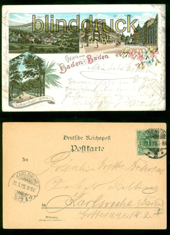 Baden-Württemberg Gruss aus Baden-Baden Litho-AK drei Ansichten 1899 nach Karlsruhe drei Ansichten: Lichtenthal, der Leopoldsplatz und Lichtenthaler Allee Karte gelaufen aus Baden-Baden 29.51899 nach Karlsruhe Ankunftsstempel Erhaltung siehe Scan