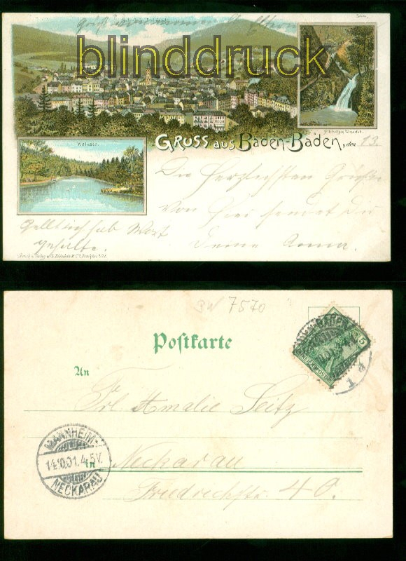 Baden-Württemberg Gruss aus Baden-Baden Litho-AK drei Ansichten 1901 nach Neckarau drei Ansichten: Waldsee, Allerheiligen-Wasserfall und Gesamtansicht Karte gelaufen aus Baden-Baden 13.10.1901 nach Neckarau Ankunftsstempel Erhaltung siehe Scan