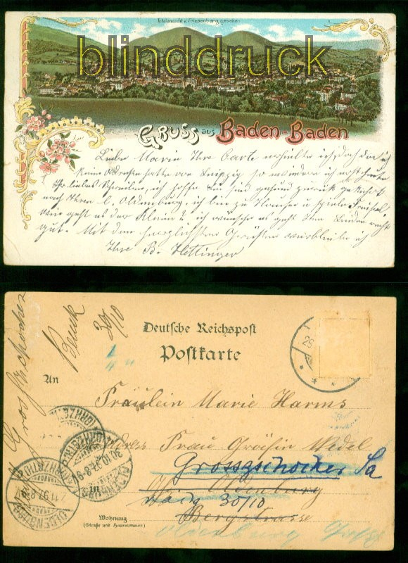 Baden-Baden Litho-AK Gruss aus ..... vom Friesenberg 1897 nach Oldenburg (d8550)