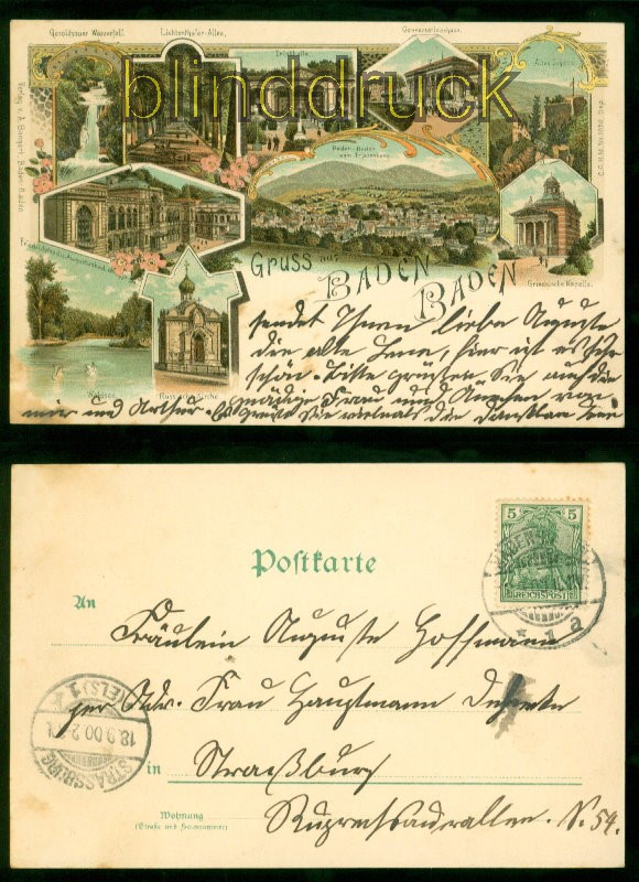 Baden-Württemberg Gruss aus Baden-Baden Litho-AK zehn Ansichten 1900 nach Strassburg drei Ansichten: Waldsee, Conversationshaus, Geroldsauer Wasserfall, Trinkhalle, Altes Schloss, ,Grichische Kapelle, gesehen vom Friesenberg, Rissische Kirche, Lichtenthaler Allee und Friedrichsbad Karte gelaufen aus Baden-Baden 18.9.1900 nach Strassburg Ankunftsstempel Erhaltung siehe Scan
