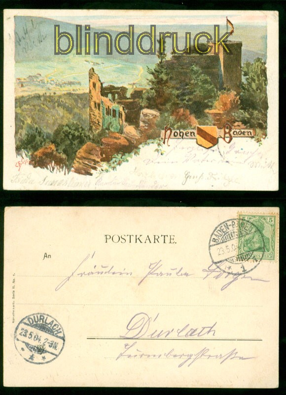Baden-Württemberg Baden-Baden farb-AK Hohen-Baden 1904 nach Durlach Karte gelaufen aus Baden-Baden 23.8.1904 nach Durlach Anlunftsstempel Erhaltung siehe Scan