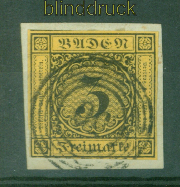 Altdeutschland Baden Mi # 2 a gestempelt 9 Kreuzer Nummernstempel 50 3 Kreuzer schwarz auf gelb entwertet mit Nummernstempel 50 für Gernsbach guter Schnitt Erhaltung siehe Scan