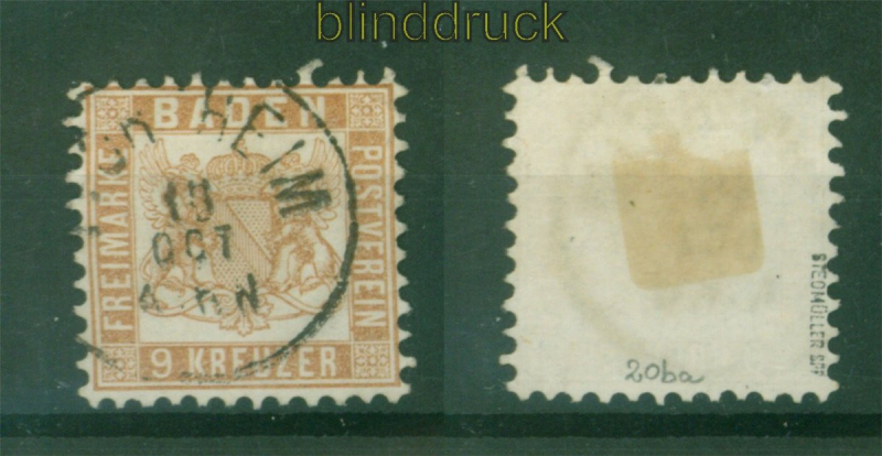 Altdeutschland Baden Mi # 20 ba gestempelt 9 Kreuzer fahlbraun geprüft Stegmüller BPP 9 Kreuzer fahlbraun Hintergrund weiß, Zähnung K 10 gestempelt geprüft Stegmüller BPP < Erhaltung siehe Scan