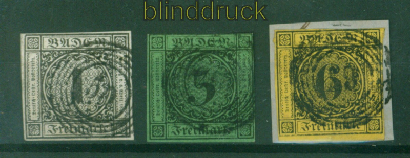 Altdeutschland Baden Mi # 5/7 gestempelt 3 Marken mit Nummernstempeln 1 Kreuzer schwarz auf weiß 3 Kreuzer schwarz auf grün und 6 Kreuzer schwarz auf gelb entwertet mit Nummernstempeln Erhaltung siehe Scan