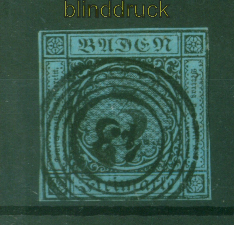 Altdeutschland Baden Mi # 8 gestempelt 6 Kreuzer Nummernstempel 43 3 Kreuzer schwarz auf blau entwertet mit Nummernstempel 43 für Freiburg Erhaltung siehe Scan