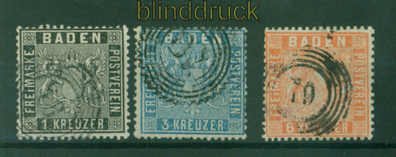 Altdeutschland Baden Mi # 9/11 gestempelt 3 Marken mit Nummernstempeln geprüft BPP 3 Marken Wappen Hintergrund liniert 1 Kreuzer und 3 Kreuzer sind geprüft Stegmüller BPP entwertet mit Nummernstempeln Erhaltung siehe Scan