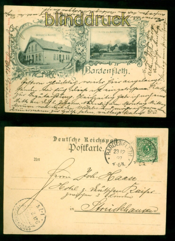 Niedersachsen Gruss aus Bardenfleth sw-AK zwei Ansichten 1897 nach Strückhausen zwei Ansichten: Gräper´s Gasthof und Kirche zu Bardenfleth Karte gelaufen aus Bardenfleth 23.12.1897 nach Strückhausen Ankunftsstempel Verlag: Feilner und Mohaupt Oldenburg Erhaltung siehe Scan