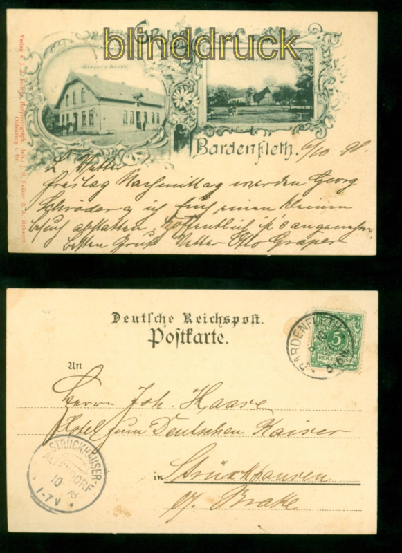 Niedersachsen Gruss aus Bardenfleth sw-AK zwei Ansichten 1898 nach Strückhausen zwei Ansichten: Gräper´s Gasthof und Kirche zu Bardenfleth Karte gelaufen aus Bardenfleth 6.10.1898 nach Strückhausen Verlag J. B. Feilner, Oldenburg Erhaltung siehe Scan