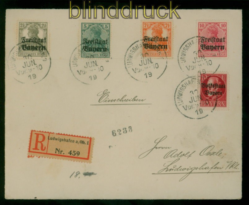 Bayern Mi # 136, 138, 139, 140 und 119 II auf VS Orts-R-Brief Ludwigshafen Aufdruckausgabe in der Pfalz-Verwendung gestempelt auf Vorderseite auf Orts-Einschreiben Ludwigshafen 30.6.1919 Erhaltung siehe Scan