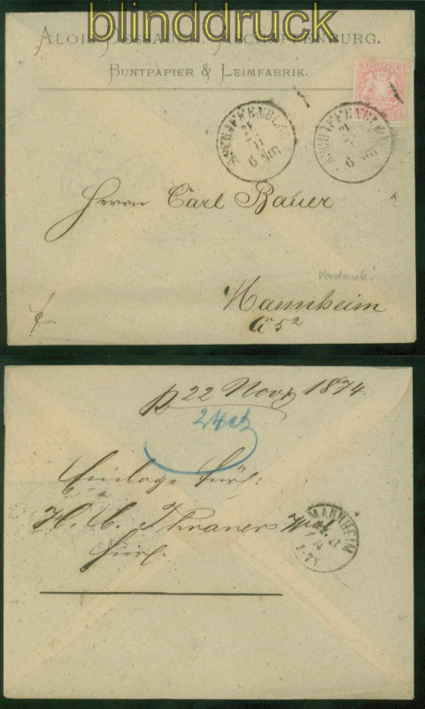 Bayern Mi # 23 Y EF auf Vordruckbrief Aschaffenburg 21.11.1874 nach Mannheim 3 Kreuzer hellkarmin mit Wasserzeichen 1 Y gelaufen aus Aschaffenburg 21.11.1874 nach Mannheim Ankunftsstempel Erhaltung siehe Scan