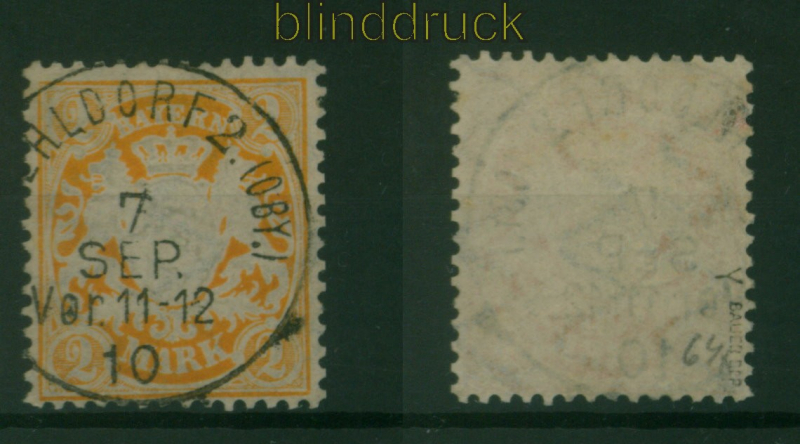 Bayern Mi # 64 y gestempelt geprüft Bauer BPP 2 Mark gelblichorange Staatswappen auf Ornament (Großformat( (IV) Wasserzeichen 3 mattgelblichweißes Papier gestempelt geprüft Bauer BPP Erhaltung siehe Scan