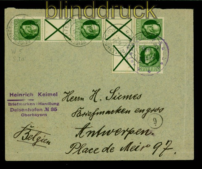 Bayern Mi # W 5, S 19 und S 20 MiF Auslandsbrief Deisenhofen nach Antwerpen 5 Pfennig König Ludwig III Zusammendrucke mit Andreaskreuz portogerechte Mehrfachfrankatur MeF auf Auslandsbrief aus Deisenhofen 31.5. (ohne Jahreszahl) nach Antwerpen in Belgien Zensur der Auslandsstelle Aachen Zusammendrucke allseitig perfekt gezähnt eine seltene Frankatur Brief rechts und unten nahe dem Rand gefaltet Erhaltung siehe Scan