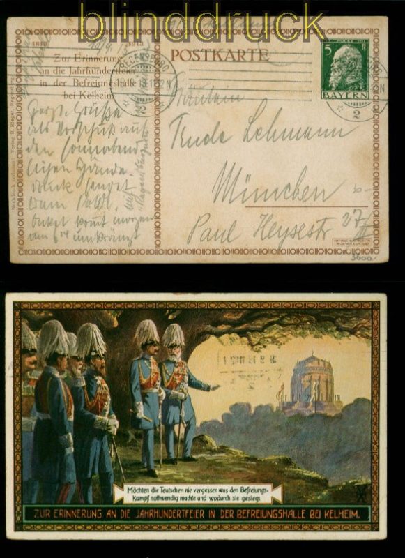 Bayern Privat-GSK PP 27 C 118 Kelheim Jahrhundertfeier Befreiungshalle 1913 5 Pfg. Luitpold grün Zur Erinnerung an die Jahrhundertfeier in der Befreiungshalle bei Kelheim Karte gelaufen aus Regensburg 18.9.1913 nach München Erhaltung siehe Scan