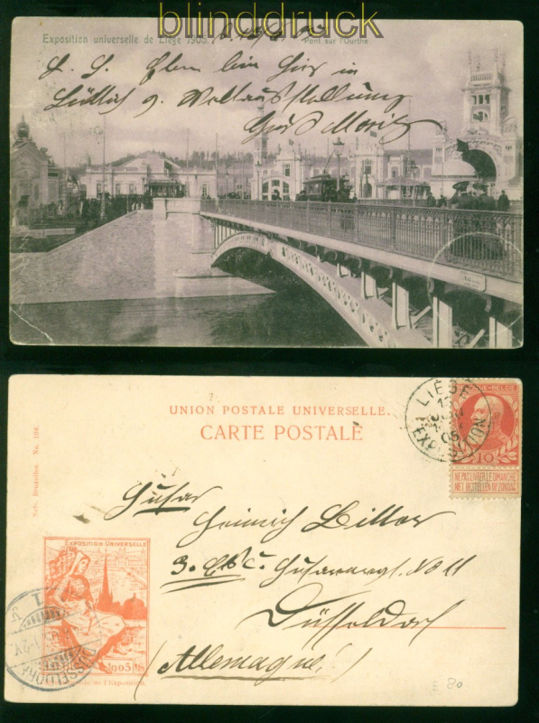Belgien Ausstellungs-Ansichtkarte Liege 1905 Pont sur l´Ourthe 1905 nach Düsseldorf Exposition universelle de Liege 1905 Karte gelaufen mit Ausstellungsstempel Liege Exposition 13.6.19058 nach Düsseldorf Erhaltung siehe Scan