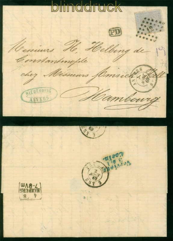 Belgien Mi # 15 OBP # 18 EF Auslands-Brief Bahnpost Antwerpen 2.8.1869 schöner Auslandsbrief mit Inhalt gelaufen aus Antwerpen 2.8.1869 nach Hamburg vorderseitiger PD-Stempel rückseitig blauer Bahnpoststempel Verviers - Cöln Ankunftsstempel Hamburg Durchgangsstempel Erhaltung siehe Scan