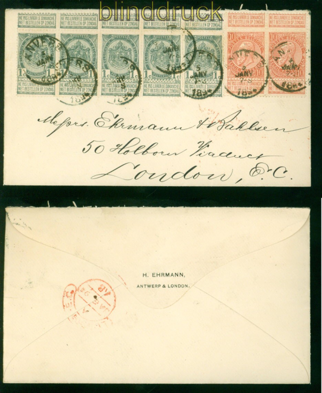 Belgien Mi # 50 (5) und 53 (2) (OBP 53 und 57) Anhängsel oben und unten Auslandsbrief 1894 schöner Auslandsbrief in Mischfrankatur 5 Marken 1 Centimes und 2 Marken 10 Centimes jede Marke mit Verbindungsleiste oben und unten auf Auslandsbrief aus Antwerpen 5.1.1894 nach London rückseitig Ankunftsstempel Erhaltung siehe Scan