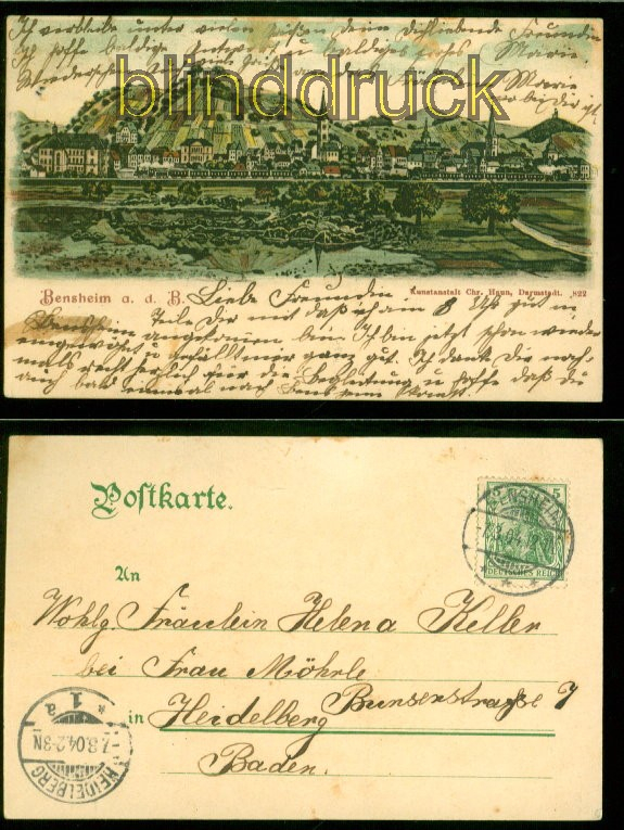 Hessen Bensheim a. d. B. farb-AK Gesamtansicht 1904 nach Heidelberg Karte gelaufen aus Bensheim 7.3.1904 nach Heidelberg Erhaltung siehe Scan
