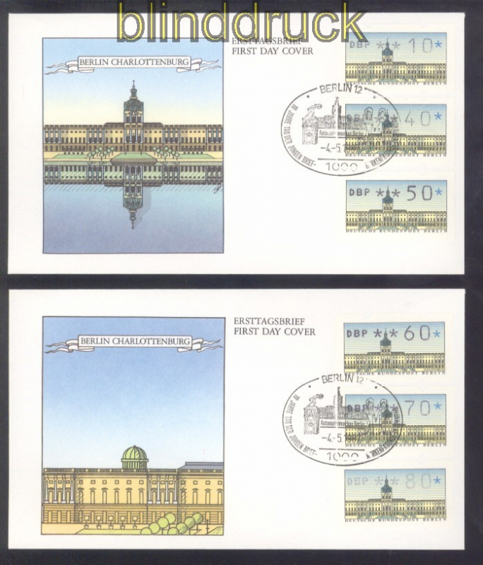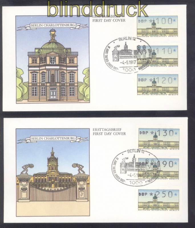Berlin ATM 1987 Mi # 1 Versandstellensatz 1 kplt. auf 5 FDC Schmuck-Ersttagsbriefen Automatenmarken Ausgabe 1987 Versandstellensatz 1 komplette Ausgabe auf 5 Schmuck-Ersttagsbriefen Erhaltung siehe Scan