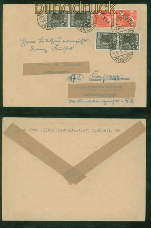 Berlin Mi # 1 (4) und 3 (2) MiF Fernbrief 7.12.1948 nach Konstanz 4 x 2 Pfennig und 2 x 8 Pfennig Schwarzaufdruck schöne Mischfrankatur von 3 senkrechten Paaren auf Fernbrief Berlin-Steglitz 7.12.1948 nach Konstanz Erhaltung siehe Scan